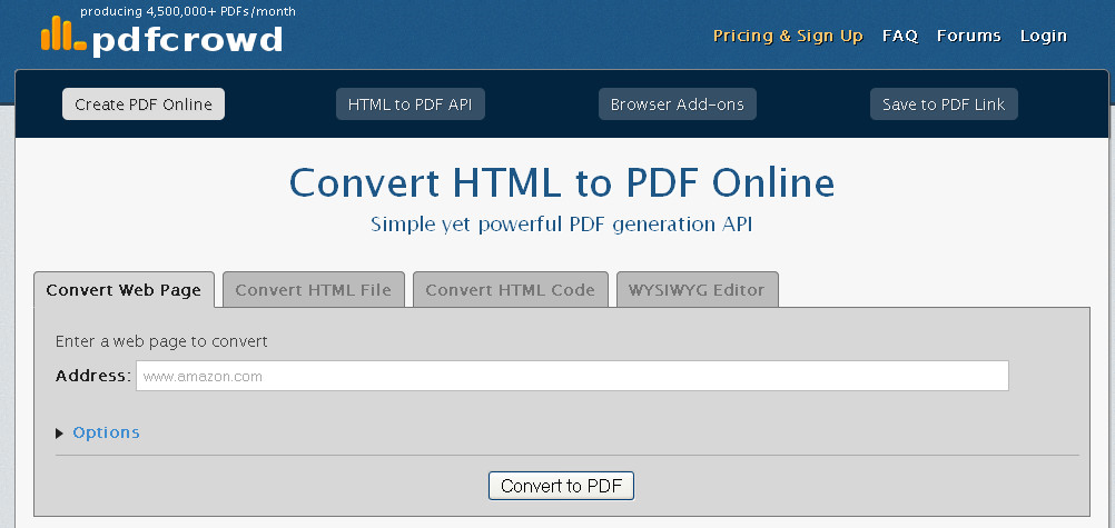 در این تبدیل کنندهها امکان تبدیل صفحه html به pdf نیز وجود دارد. بدین صورت که شما لینک html خود را در کادر مورد نظر وارد میکنید و گزینه convert to PDF را کلیک کرده و صفحه مورد نظر به صورت فایل pdf برای شما دانلود میشود. یکی از مناسبترین سایتها که این عمل را انجام میدهد سایت pdfcrowd به نشانی اینترنتی http://pdfcrowd.com است. شما پس از وارد شدن به صفحه مورد اشاره با این صفحه (تصویر صفحه) روبرو میشوید.